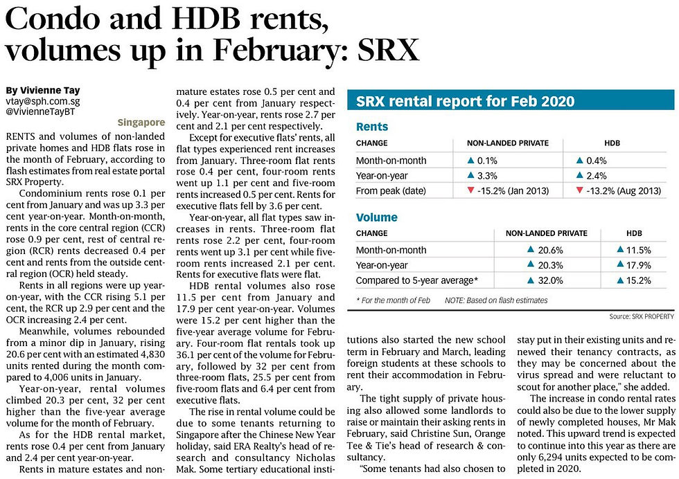 Condo and HDB rents, volume up in February: SRXProperty News in SgMar 12, 20201 min readUpdated: Mar 30, 2020Business Times 12 Mar 2020